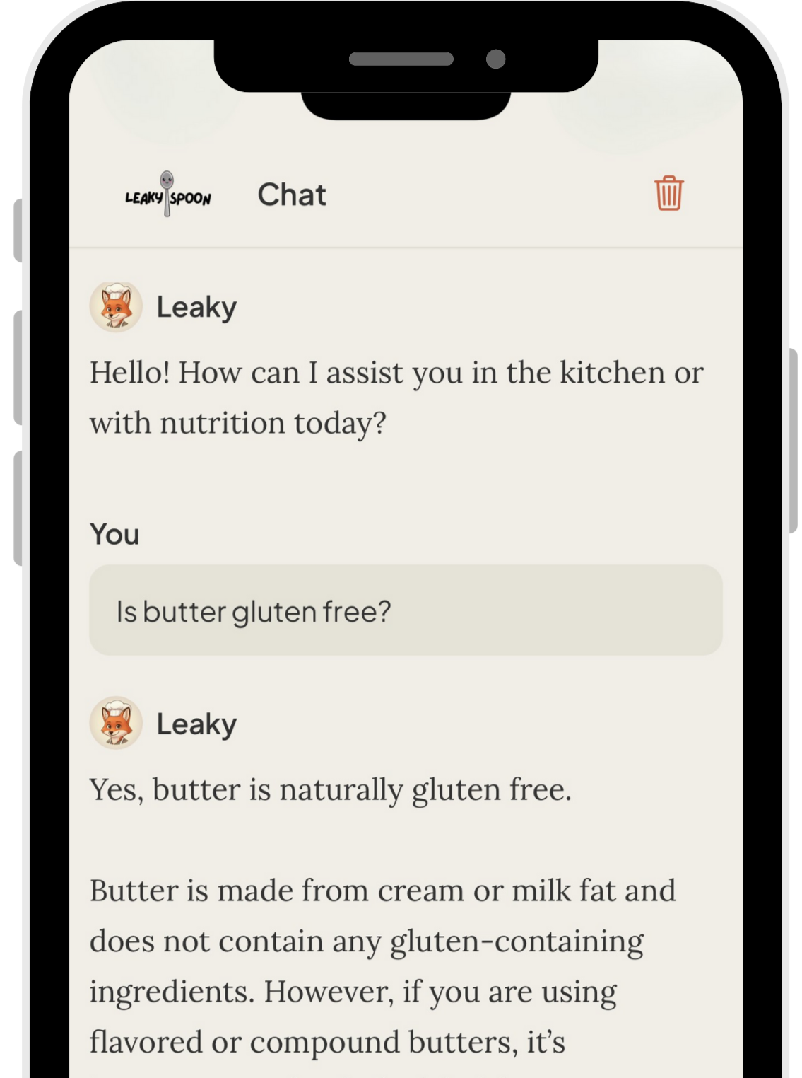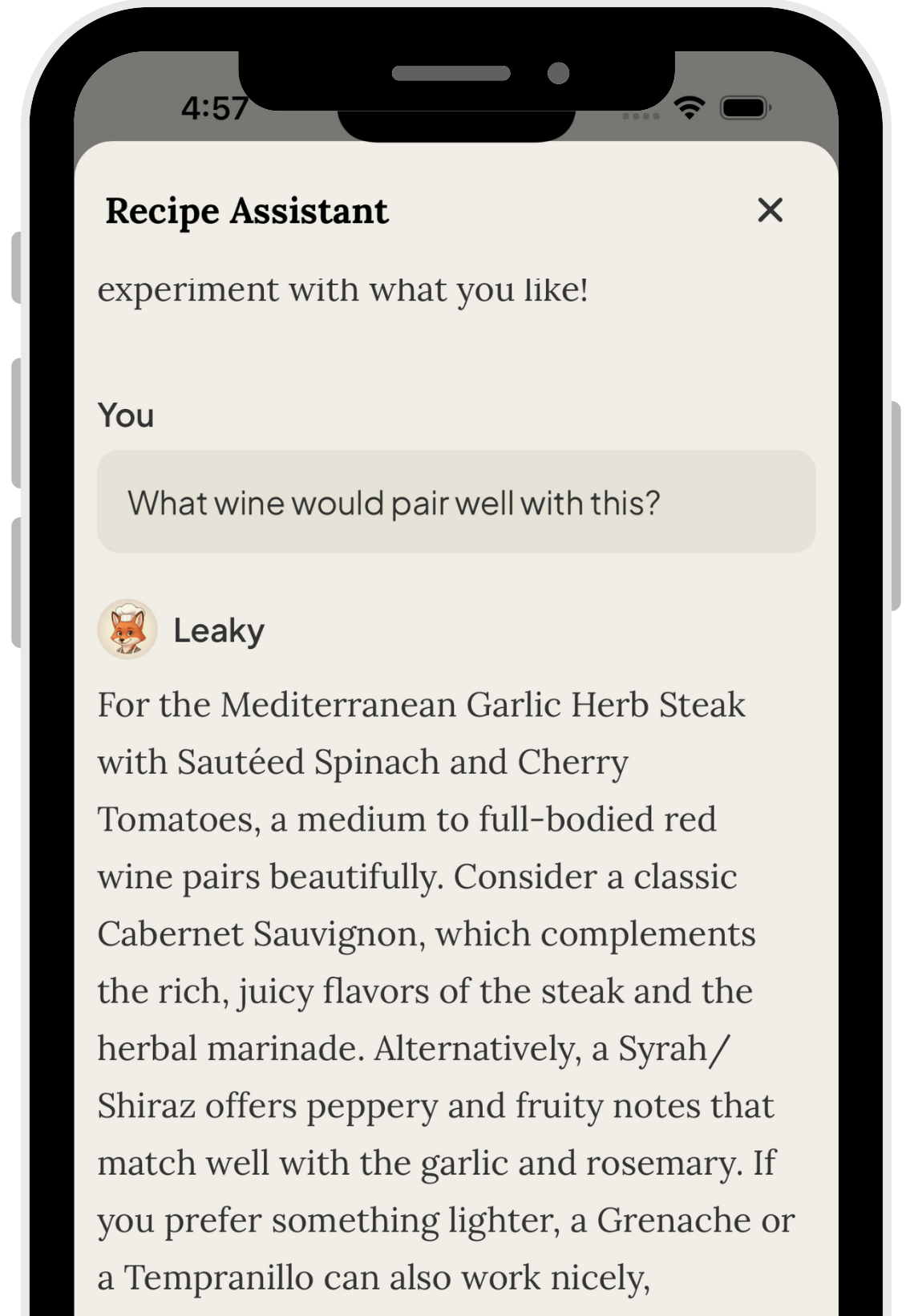 Chat naturally, get expert answers, and cook with confidence—Leaky knows food inside and out.